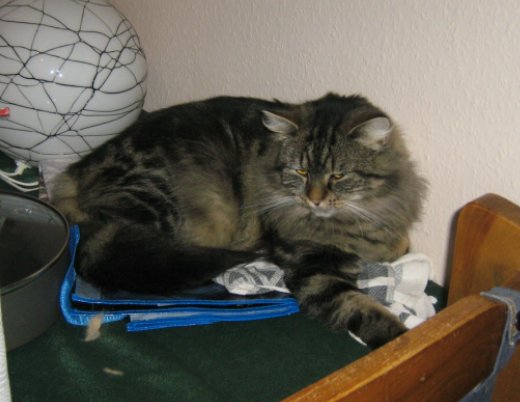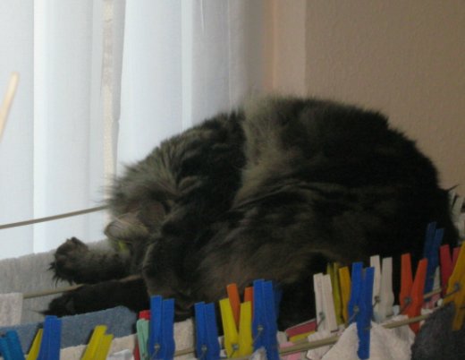 und Anna ist sauer das auf ihrem Lieblingswäscheständer zur Zeit kein Teppich liegt (einer liegt im Wohnzimmer und der andere befindet sich gerade in der Waschmaschine), wo legt sie sich also hin ........... auf den anderen Wäscheständer wo eigentlich Handtücher trocknen sollen! Wäscheklammern die stören werden einfach abgemacht und landen auf dem Boden "grrrr".
